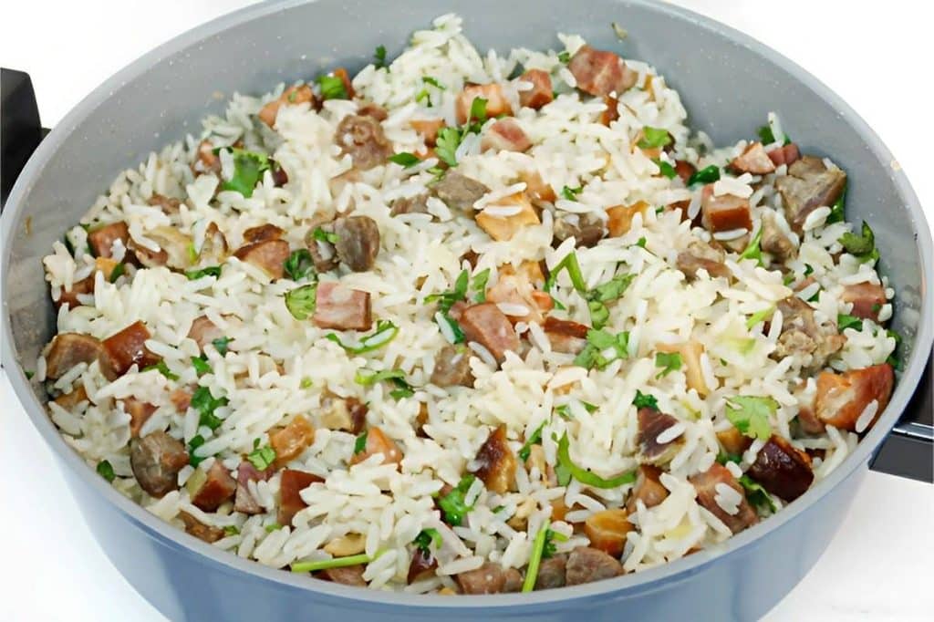 Além de ser uma delícia por completo, essa receita também tem um modo de preparo muito fácil e simples, não tem segredos. Começamos dessalgando a carne seca que utilizaremos, e depois vamos cortar a carne seca, o bacon e a linguiça calabresa em pequenos cubos. Assim que as proteínas da receitas estiverem devidamente cortadas, vamos levá-las para uma panela com um fio de azeite para fritar. Quando tudo estiver bem douradinho, vamos refogar alho e cebola para entrar com o arroz logo na sequência. Depois de mexer bem, então cobrimos com água e aguardamos secar. Quando secar todo a água, é só finalizar com cheiro-verde picadinho!