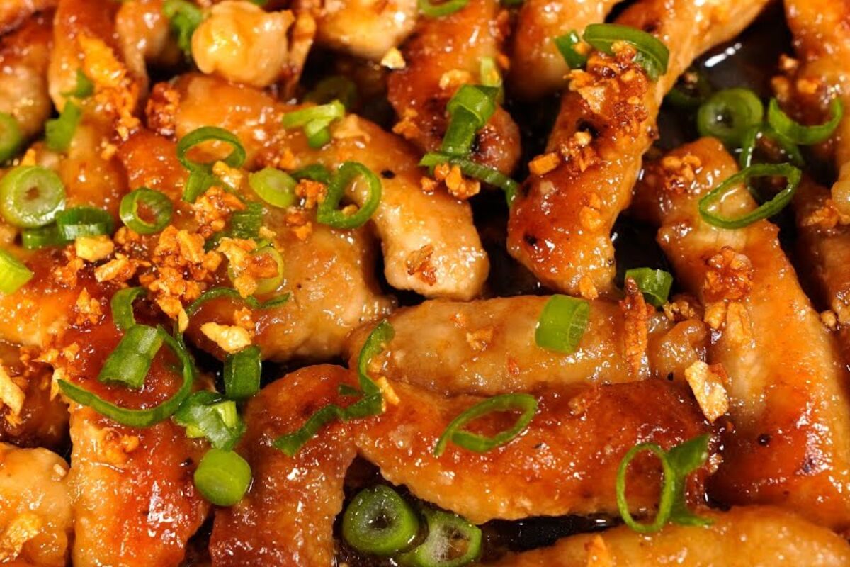 - Adicione o shoyu, a água, mexa bem e deixe ferver para encorpar. Retire do fogo, disponha numa travessa, polvilhe o alho frito e finalize com cebolinha verde.