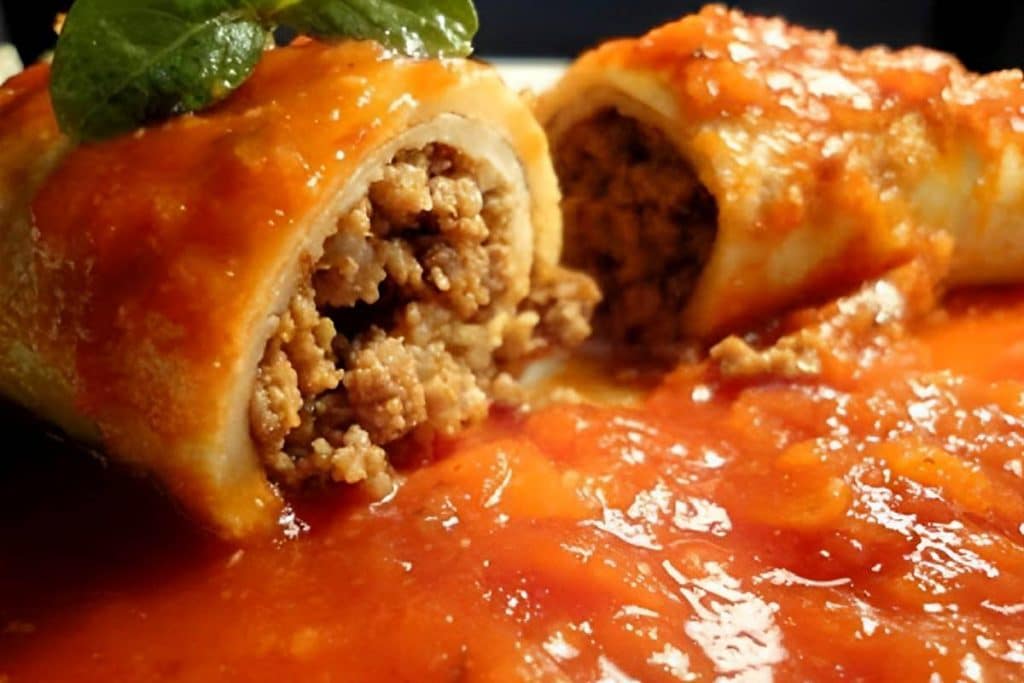 - Recheie as panquecas com porções de carne moída e enrole-as.