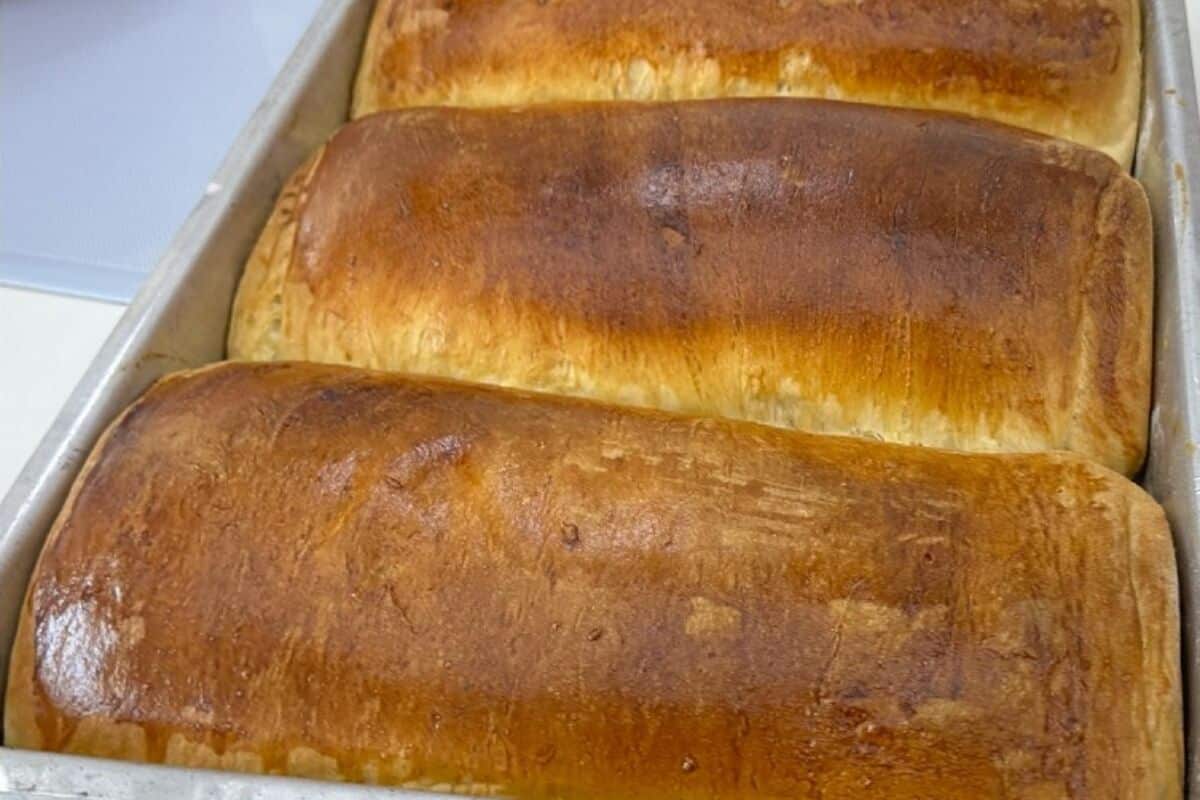 - Repita esse processo com o restante das partes de massa, adicione os 3 pães em uma assadeira untada e enfarinhada e deixe crescer por 1 hora e 30 minutos.