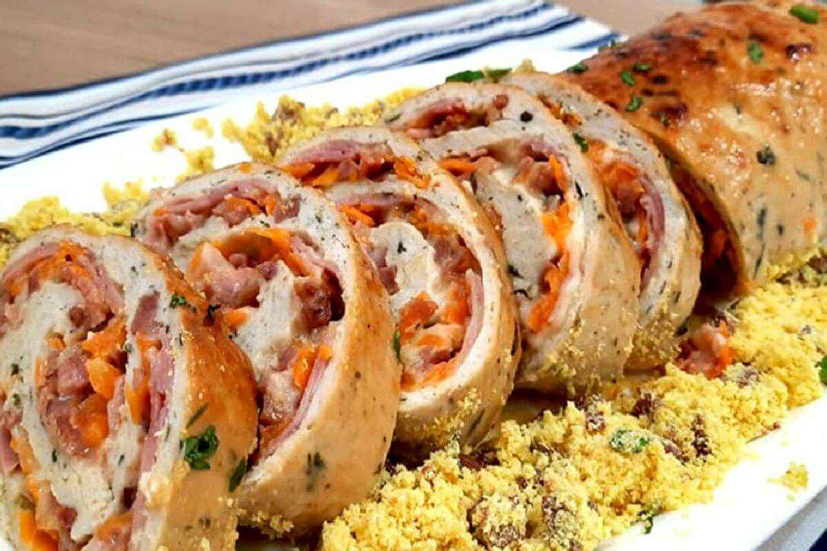 - Transfira para uma travessa, salpique cheiro-verde picado, sirva e desfrute do seu apetitoso rocambole de frango recheado!
