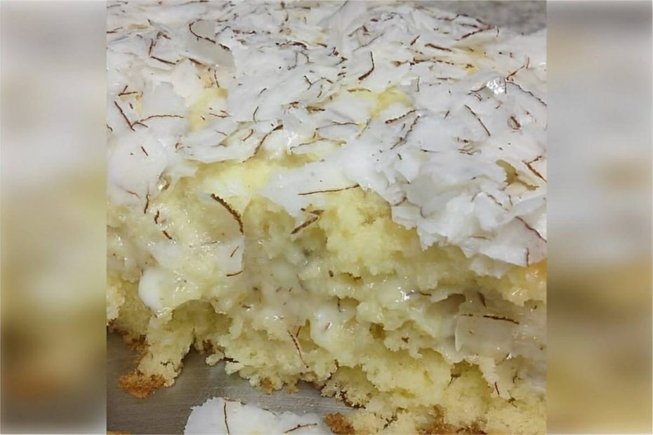 Bolo de coco gelado recheado e bem molhadinho feito com coco em fitas