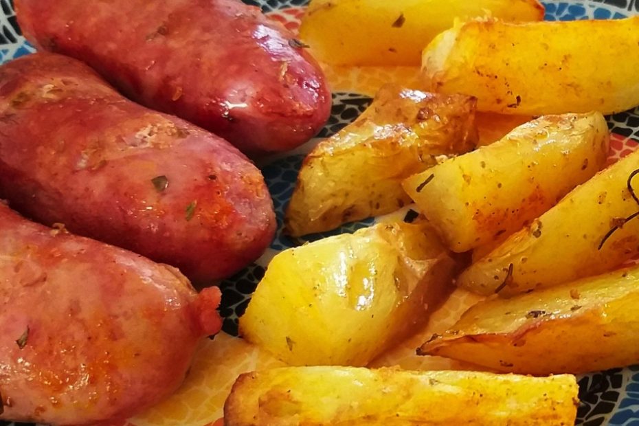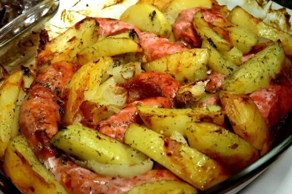 Linguiça assada com batatas no forno uma receita rápida para a correria