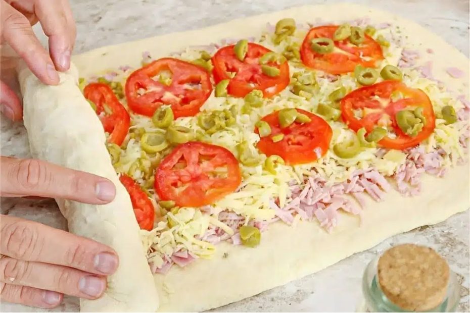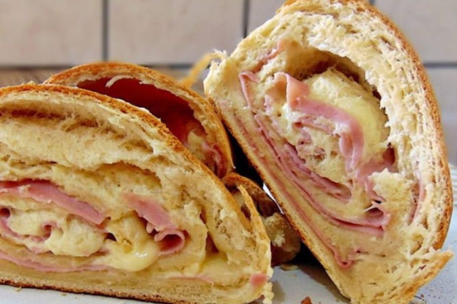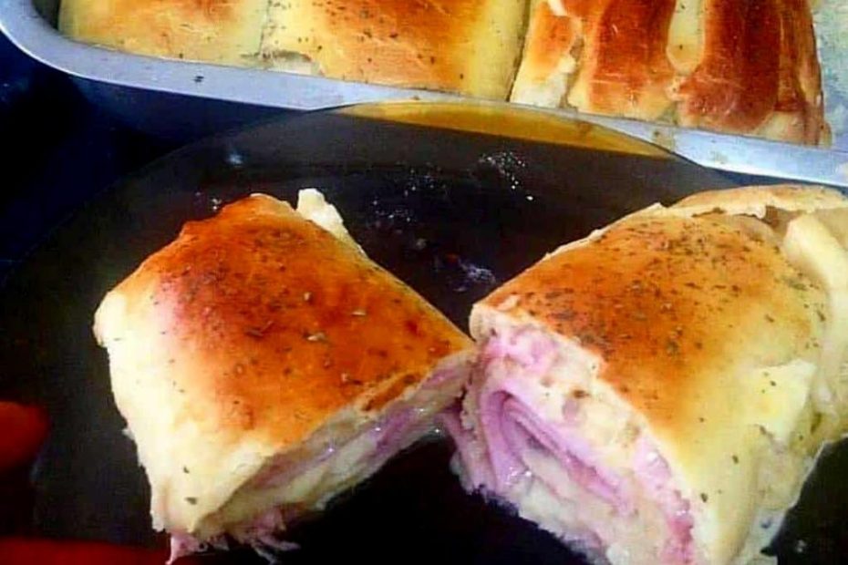 Pão caseiro enrolado recheado, com massa fofinha e recheio de presunto e muçarela